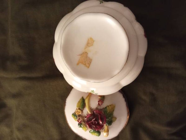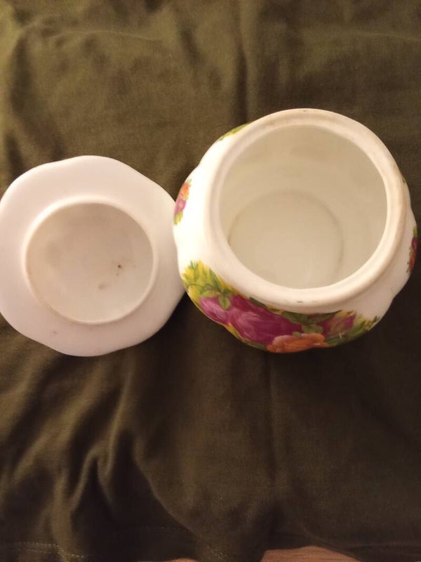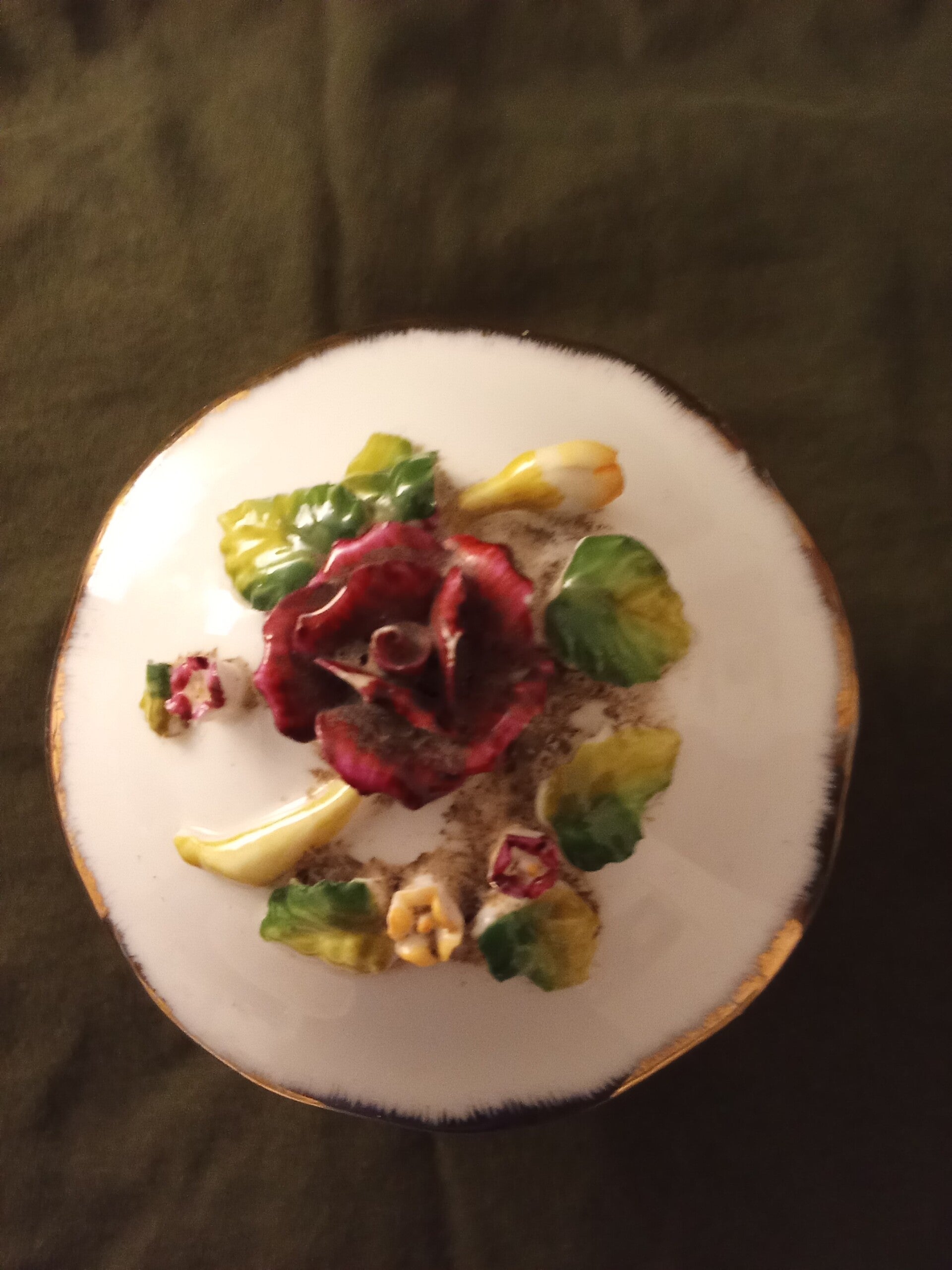A Small decorative pot with a hand painted flower on the lid. the pot and lid are in excellent condition with no chips or cracks.
