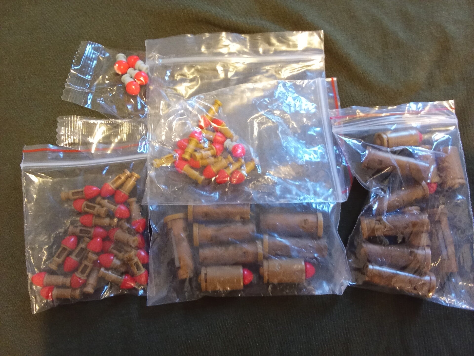 Several platic cartridges and red plastic bullets come with the semi automatic firing gun.